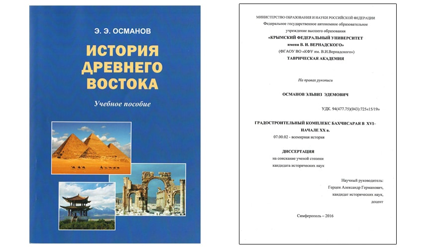 - Османов Э.Э. Градостроительный комплекс Бахчисарая в XVI-начале XX вв. Специальность 07.00.02 – Всемирная история : диссертация на соискание ученой степени кандидата исторических наук. – Симферополь, 2016. – 348 с. — Библиогр.: с. 184-221.