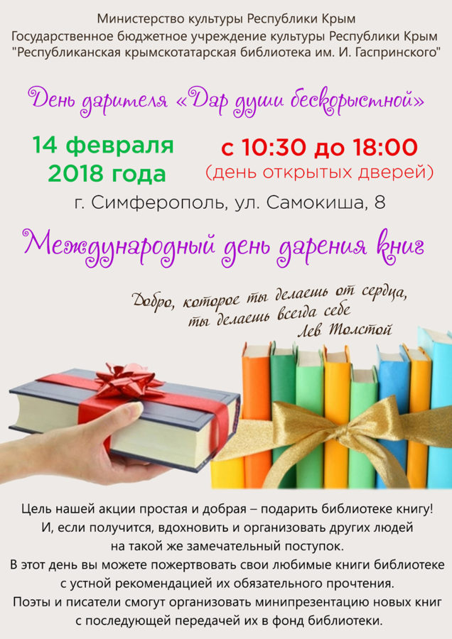 Мероприятие посвящено молодому празднику – Международному дню дарения книг, который объединяет всех, кто не только сам любит книги, но и дарит возможность чтения другим людям.