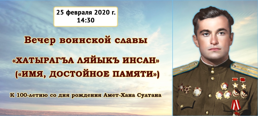 25 февраля 2020 года в 14:30 в Республиканской крымскотатарской библиотеке им. И. Гаспринского при поддержке Министерства культуры Республики Крым состоится вечер воинской славы «Хатырагъа ляйыкъ инсан» («Имя, достойное памяти»). Мероприятие пройдет накануне Дня защитника Отечества и будет посвящено 100-летию со дня рождения заслуженного летчика-испытателя СССР, участника Великой Отечественной войны, дважды Героя Советского Союза Амет-Хана Султана (1920-1971).