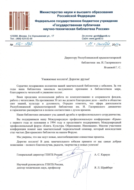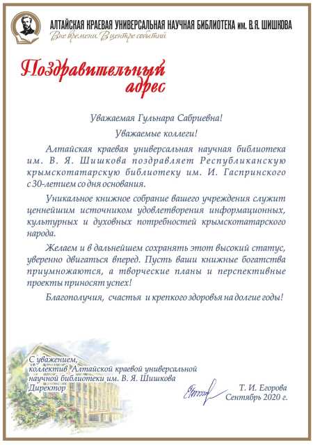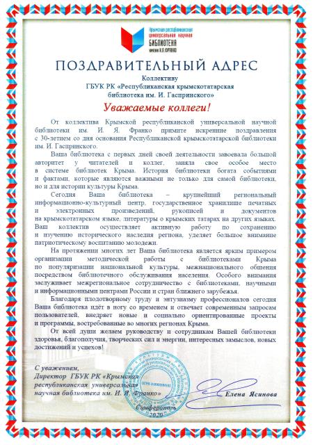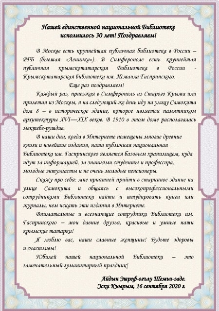 Республиканская крымскотатарская библиотека имени Исмаила Гаспринского благодарит читателей, коллег, друзей за теплые поздравления в связи с 30-летием со дня основания учреждения. Мы признательны всем, кто все эти годы остается с Библиотекой и является истинным ценителем Слова, Книги, Литературы.