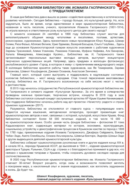25 сентября 2020 года в Республиканской крымскотатарской библиотеке имени Исмаила Гаспринского при поддержке Министерства Культуры Республики Крым прошел библиофест «Китапханемиз – 30 яшында» («Библиотеке – 30»), посвященный 30-летию со дня основания Республиканской крымскотатарской библиотеки им. И. Гаспринского.