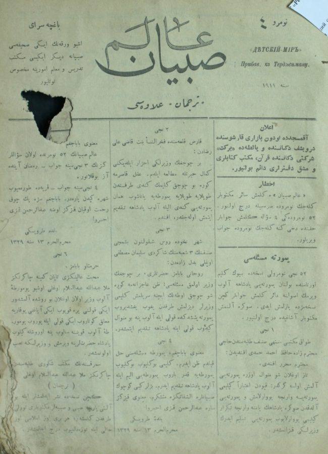 Сотрудники ГБУК РК «Республиканская крымскотатарская библиотека им. И. Гаспринского» выражают благодарность студенту КФУ Осману Бекирову за переданные в отдел редких книг и книжных памятников подшивку отдельных номеров приложений к газете «Терджиман» «Алем-и субьян» и «Алем-и нисван» за 1911 год и газету «Асрий мусульманлыкъ» (1924, № 14).