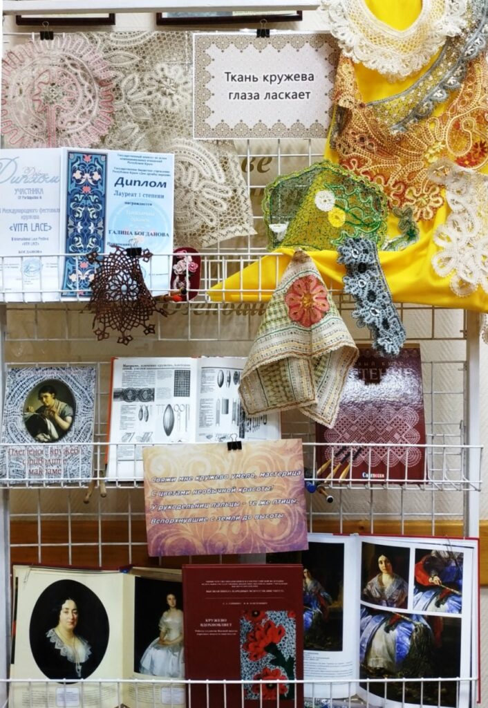 Ажурные воздушные изделия Галины Григорьевны могут стать как украшением женского образа, так и частью интерьера. Экспозицию дополнила тематическая литература из фонда библиотеки.