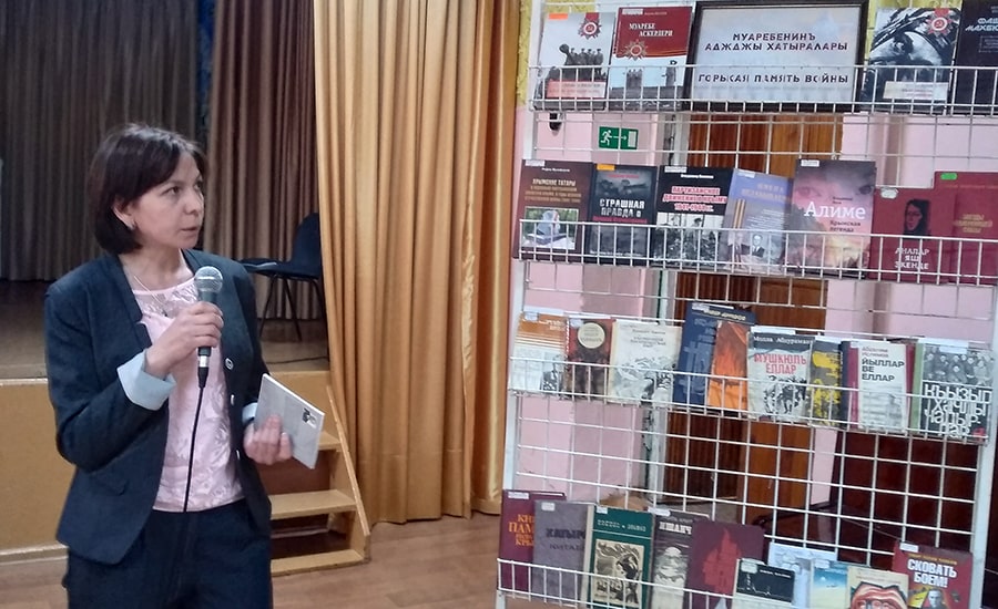 Ведущий библиограф информационно-библиографического отдела Зарема Ислямова презентовала книжную выставку «Муаребенинъ аджджы хатыралары» («Горькая память войны») и рассказала о том, как военная тематика нашла отражение в крымскотатарской литературе.