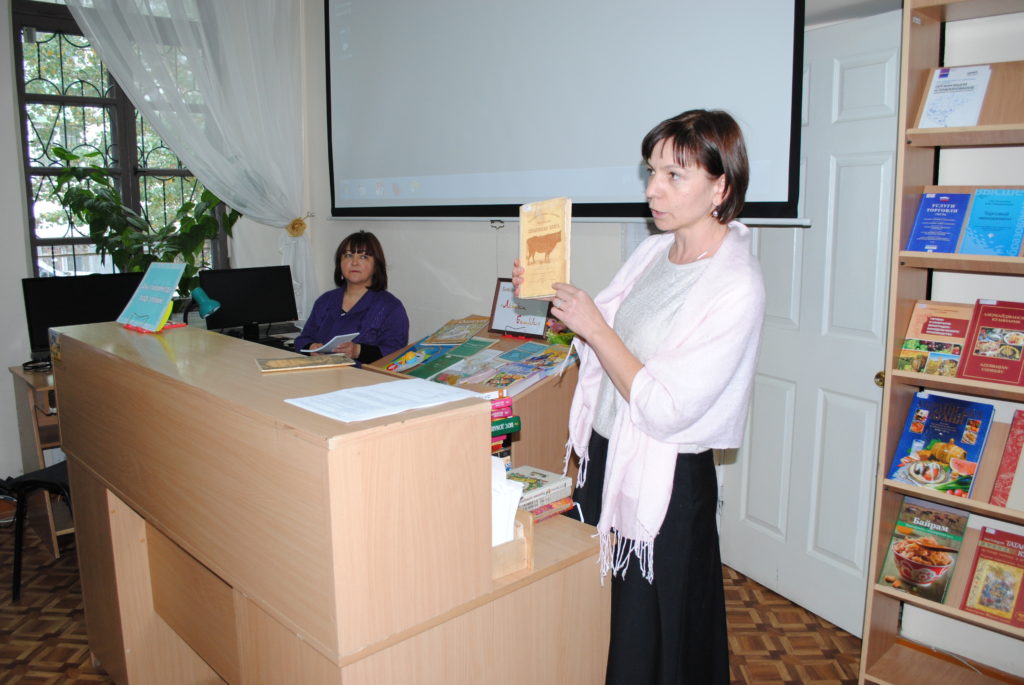 В этот день вниманию студентов представили выставку-эдвайзер новой литературы «Школа организации сервиса», подготовленную на основе специализированных книг. Ведущий библиограф Зарема Ислямова рассказала о традициях и новаторстве в кулинарном искусстве в формате «информационной заправки», а дополнением к ее выступлению стала викторина «Кухни народов мира».