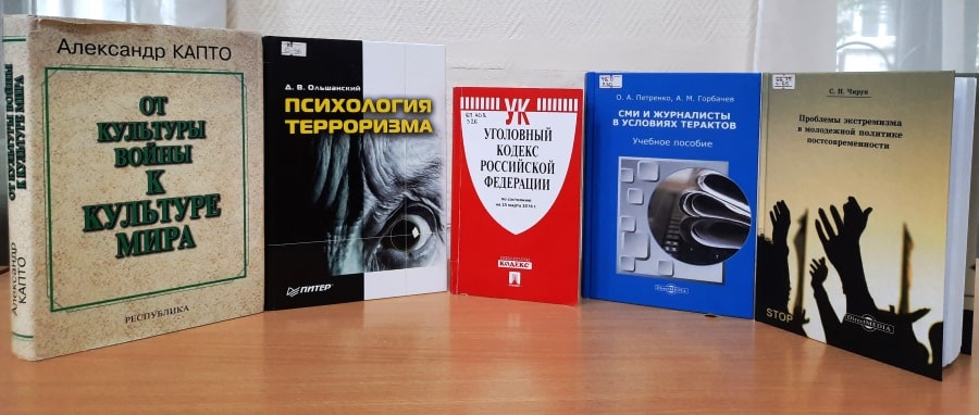 В читальном зале библиотеки была организована тематическая полка, которая будет интересна не только специалистам в области психологии, политологии, философии, социологии, юриспруденции, но и студентам вузов соответствующих специальностей, а также всем тем, кого волнуют вопросы политического развития мирового сообщества и проблемы терроризма.