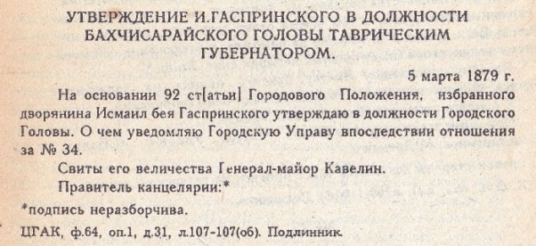 5 марта 1879 г. И. Гаспринский в возрасте 28 лет был утвержден в должности Бахчисарайского городского головы Таврическим губернатором А. А. Кавелиным.