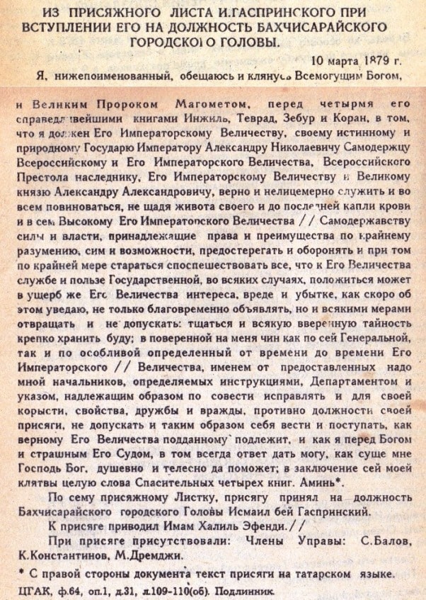 При принятии присяги И. Гаспринский подписал присяжный документ