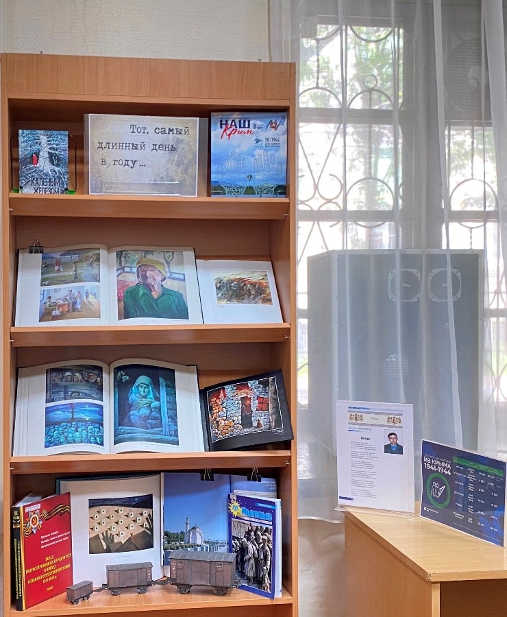 Сотрудниками библиотеки была подготовлена тематическая полка «Тот, самый длинный день в году», на которой представлены книги, фотографии и документальные материалы, которые освещают исторические события, связанные с депортацией крымских татар и других народов Крыма в 1944 году.
