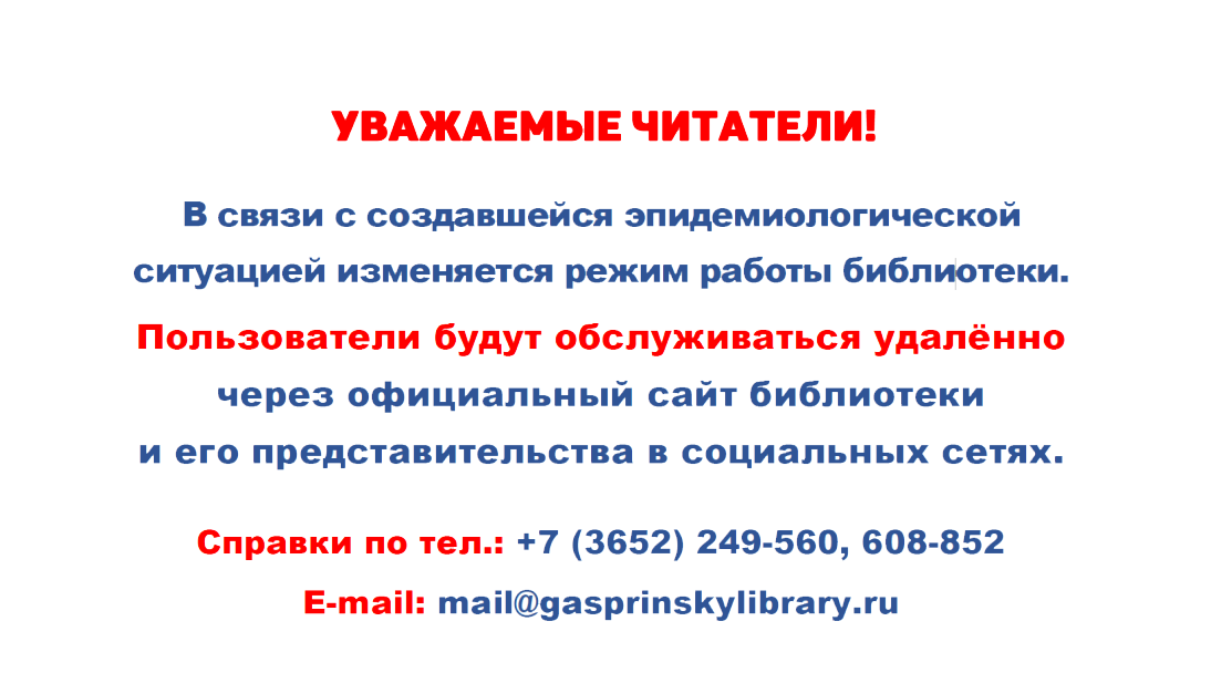 Анонсы и объявления Бектемиров Эльдар 14.04.2020 0 Комментарии ВНИМАНИЕ! ИЗМЕНИЛСЯ РЕЖИМ РАБОТЫ БИБЛИОТЕКИ! Уважаемые читатели! В связи с создавшейся эпидемиологической ситуацией изменяется режим работы библиотеки. Пользователи будут обслуживаться удалённо через официальный сайт библиотеки и его представительства в социальных сетях. Справки по тел.: +7 (3652) 249-560, 608-852 E-mail: mail@gsp.q-wa.ru Документ, на основании которого приняты указанные меры Администрация