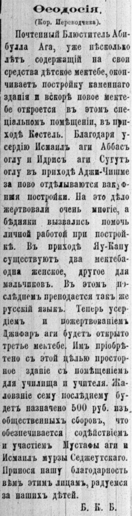 Б. К. Б. (Кор. Переводчика). Феодосiя : [Почтенный Блюститель Абибулла Ага несколько лет содержит на свои средства детское мектебе, строит каменное здание мектебе в приходе Кастель] / Б. К. Б. – Текст : непосредственный // Переводчик. – 1888. – 10 апр. (№ 13). – С. 26.