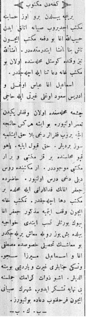 Б. К. Б. Кефеден мектюп : [озь эсабына мектеп ачтырып субьяне аталыкъ иден Абибулла агъа мектеп ичюн таш бина эттиреджеги] / Б. К. Б. – Текст : непосредственный // Терджиман. – 1888. – Апр. 10 (№ 13). – С. 2.