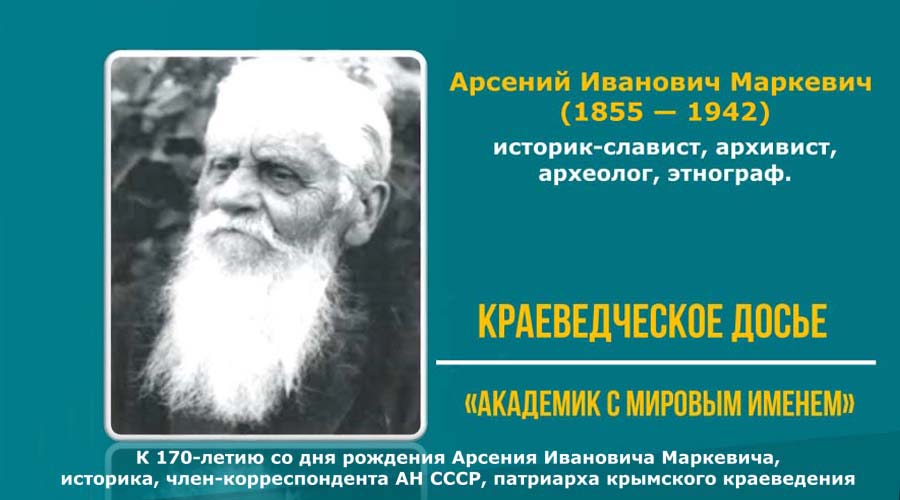 К 170-летию со дня рождения Арсения Ивановича Маркевича предлагаем заглянуть в краеведческое досье историка-слависта, архивиста, археолога, этнографа и краеведа. В подготовленном Библиотекой видеообзоре вашему вниманию представлены сведения о его исследовательской и публицистической деятельности в Таврической ученой архивной комиссии, а также книги и монографии, изданные современными учеными, которые в своих изысканиях опирались на труды академика с мировым именем.