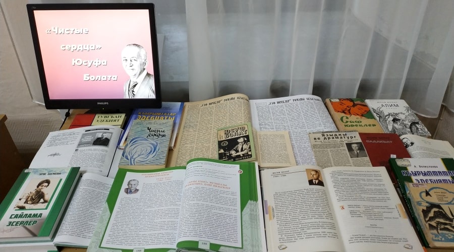 Сотрудниками отдела обслуживания пользователей была подготовлена книжная выставка «Чистые сердца» Юсуфа Болата» и проведен обзор творческого наследия известного писателя и драматурга, публикаций о нем и его произведениях в различных национальных изданиях, хранящихся в фондах библиотеки.
