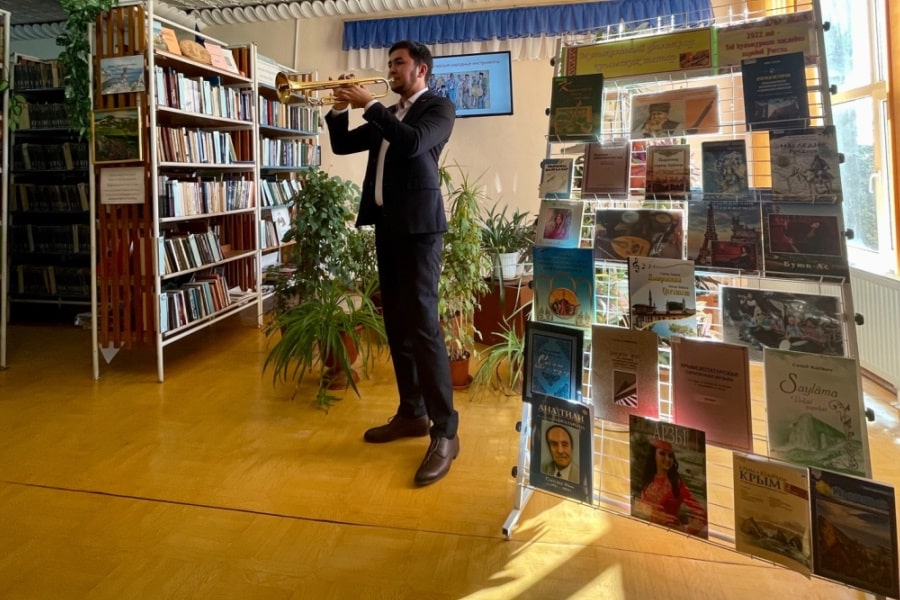 Читательница библиотеки и преподаватель крымскотатарского языка МБОУ «Раздольненская школа-лицей №1» Эльзара Сулеймановна Аблязова рассказала историю создания песни «Эй, гузель Къырым», написанную в депортации и ставшей народной. Педагог МБУДО «Раздольненская Детская Школа Искусств» Рудем Ревупович Ибрагимов исполнил композицию «Эмир Джелал ве Хайтарма» на трубе для всех присутствующих. В завершении мероприятия библиотекарь поблагодарила всех участников за внимание и угостила их вкусным курабье.