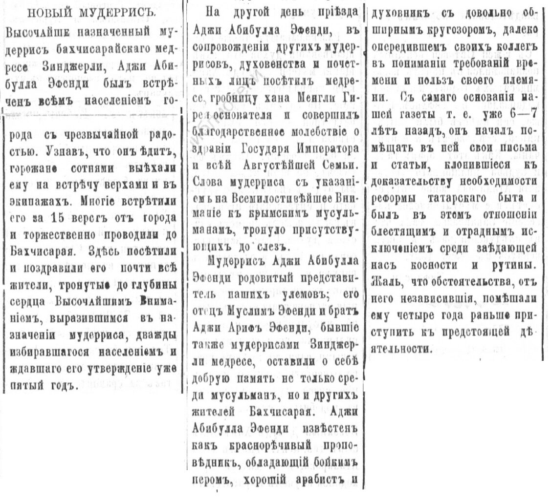 [Гаспринский, Исмаил]. Новый мудеррис : [Аджи Абибулла Эфенди — новый мудеррис Зынджырлы медресе; о встрече его горожанами, о его успехах в сфере образования и глубине знаний] / [Гаспринский, Исмаил]. – Текст : непосредственный // Переводчик.– 1890. – 9 февраля (№ 5). – С. 1.