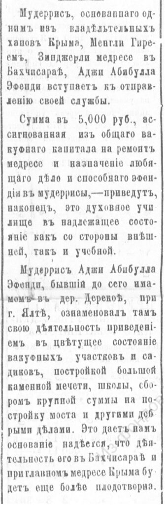 [Гаспринский, Исмаил]. [О деятельности мудерриса Зинджерлы медресе Аджи Абибуллы Эфенди] / [Гаспринский, Исмаил]. – Текст непосредственный // Переводчик. – 1890. – 30 янв. (№ 4). – С. 1.