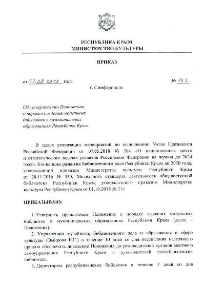 Приказ об утверждении Положения о порядке создания модельных библиотек в муниципальных образованиях Республики Крым