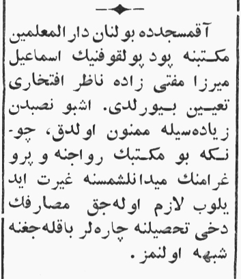 [Акъмесджитте булунан дар-уль малюмин мектебинде подполковник Исмаил Мырза Муфти заде…]. – Текст непосредственный // Терджиман. – 1891. – Сент. 19 (№ 32). – С. 1.