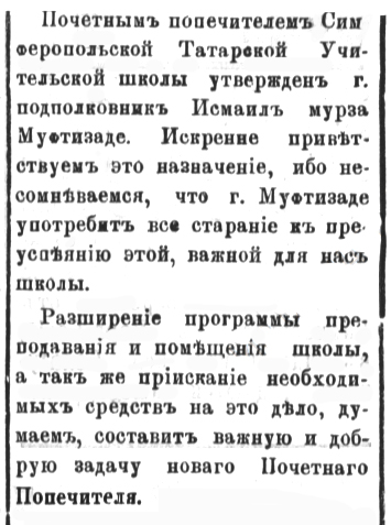 [О назначении попечителем Симферопольской Татарской учительской школы г. подполковника Исмаила Муфтизаде и необходимости расширения программы преподавания] – Текст непосредственный // Переводчик. – 1891. – 19 сент. (№32). – С. 1.