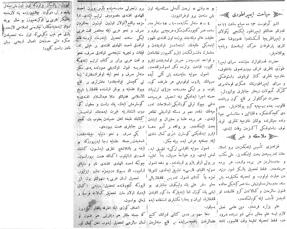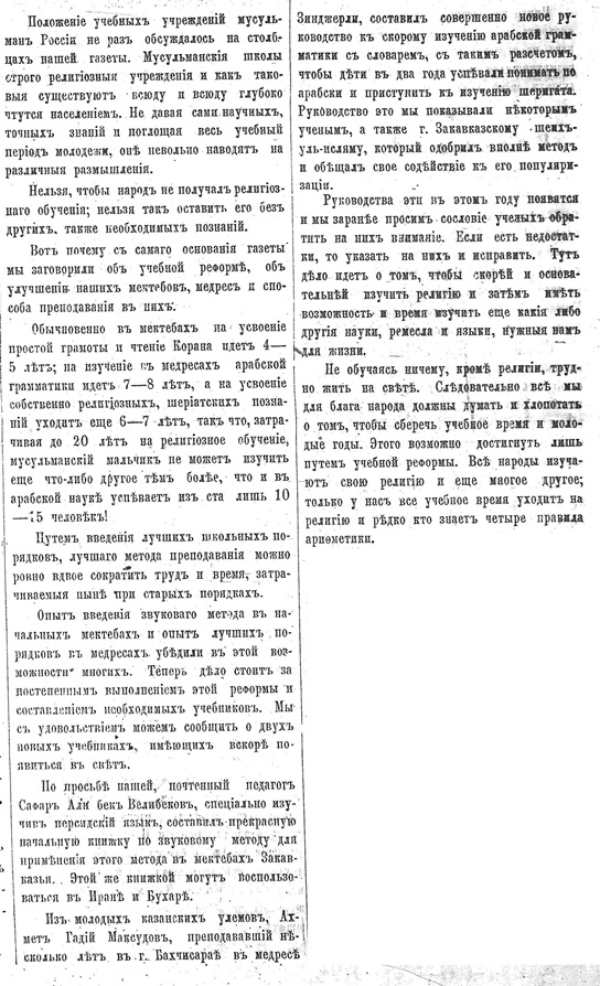 [О положении учебных учреждений и педагогической деятельности Сараф Али бека Велибекова (Закавказье) и Махмет Гадия Максудова (преподавал в медресе Зинджирли в Бахчисарае)]. – Текст непосредственный // Переводчик. – 1896. – 25 авг. (№ 33). – С. 1.