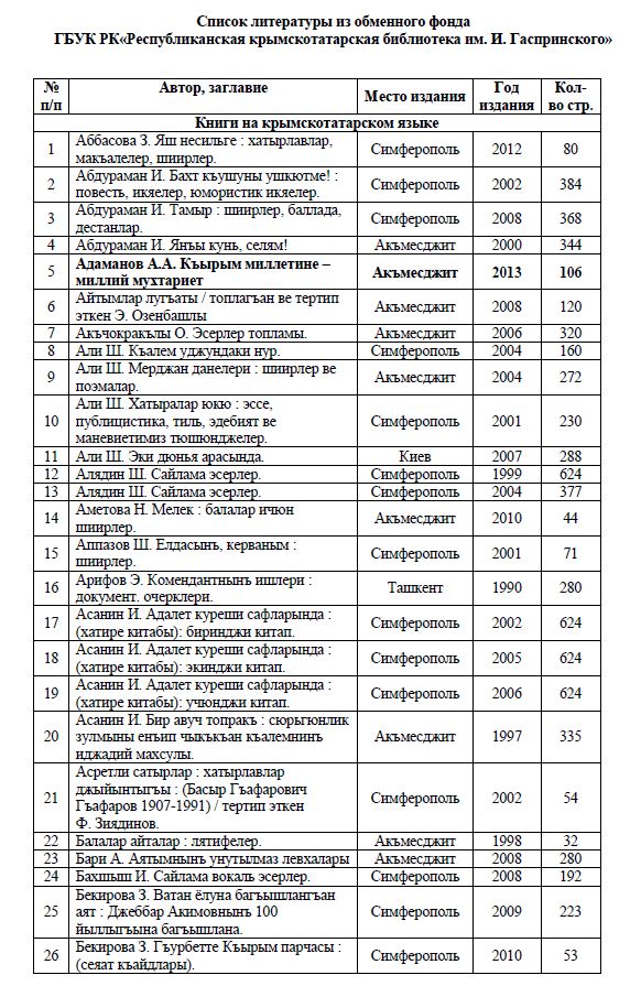 Предлагаем Вашему вниманию список изданий, которые имеются в обменном фонде ГБУК РК «Республиканская крымскотатарская библиотека им. И. Гаспринского». Документы расположены в алфавитном порядке.