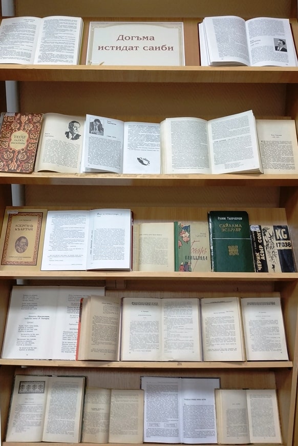 Особое место на выставке занимают повести, рассказы и переводы юбиляра. Повышенный интерес вызывает книга «Черик асыр сонъ» («Спустя четверть века»), изданная в 1970 году.