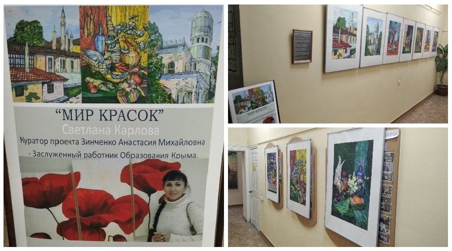 Автор работ – художник и дизайнер Светлана Карлова. «Мир красок» – первая персональная выставка художницы. В экспозиции представлены 10 картин: архитектурные памятники полуострова и натюрморты, выполненные гуашью. Куратор проекта – руководитель изостудии «Этюд», заслуженный работник образования Республики Крым Анастасия Зинченко. Она познакомила участников мероприятия с автором работ, отметив творческий потенциал художницы.