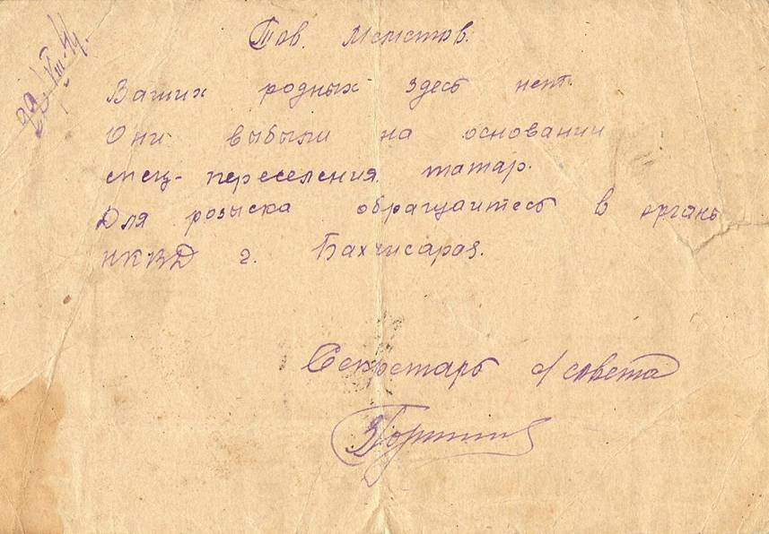 Ваших родных здесь нет. Они выбыли на основании спец. Переселения татар. для розыска обращайтесь в органы НКВД г. Бахчисарая.