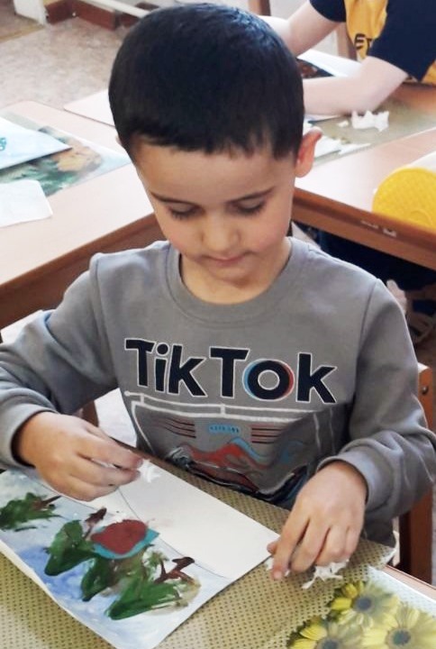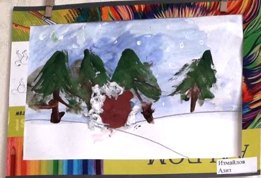 Один из самых юных участников клуба «Чокърачыкъ» («Родничок») Азиз Измаилов нарисовал рисунок на тему зимнего леса и украсил его пластилиновыми елочками.
