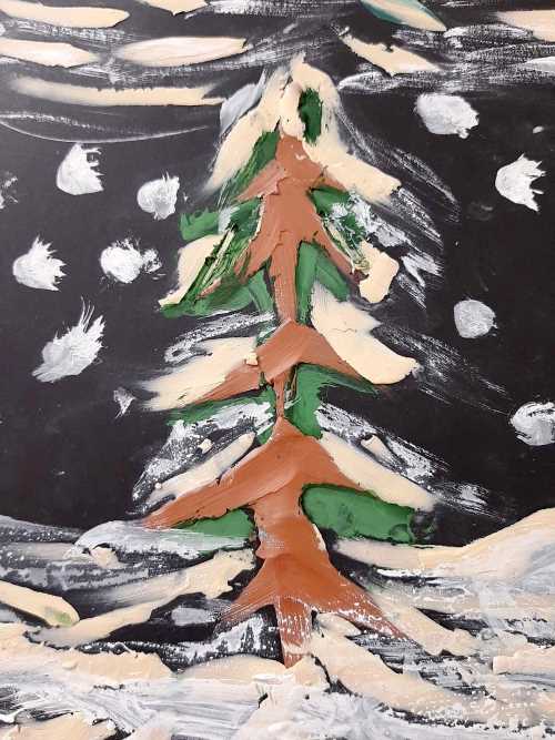 сделанную из пластилина на бумаге елочку в зимнем лесу