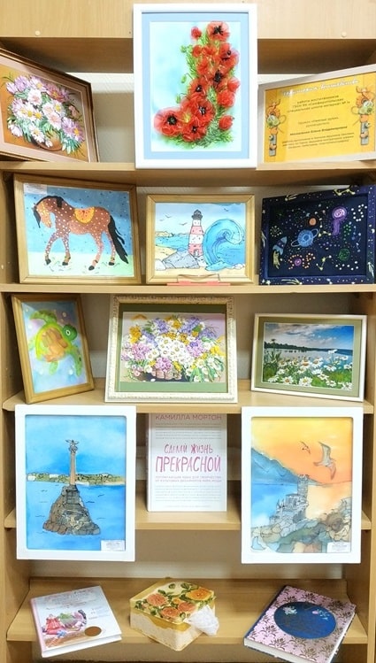 «Космический лабиринт», «Море», «Хризантемы», «Ромашковое поле», «Маки», «Гурзуф», «Черепашка» и «Расписная лошадка» — картины и панно с такими названиями, выполненные в техниках: вышивка лентами, контурными швами, бисером и пайетками, роспись по ткани, пластилинография, стали иллюстрациями к литературе, представленной на книжных стеллажах и полках.