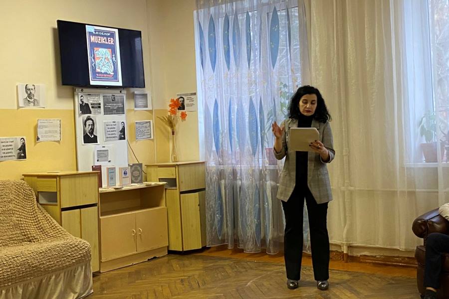 Сотрудник отдела обслуживания пользователей презентовала виртуальную выставку «Антон Павлович Чеховнынъ эсерлери къырымтатар тилинде» («Произведения Антона Павловича Чехова на крымскотатарском языке»), знакомящую с переводами классика из редкого фонда библиотеки.