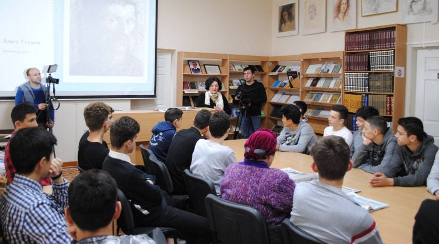 Вниманию молодежи, также, была представлена медиапрезентация работ художника, в которую вошли прекрасные крымские пейзажи, портрет крымскотатарского кедая (сказителя) Джангазы Шерфединова 1948г. и др.