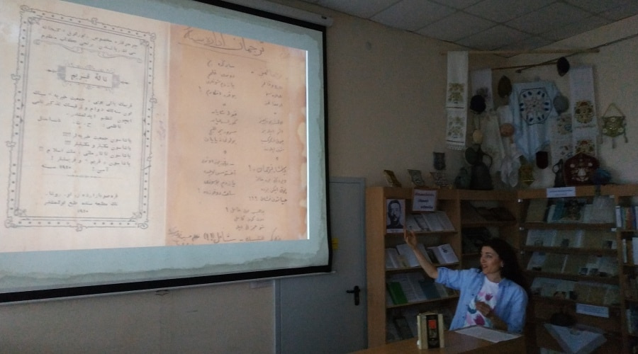 Во время мероприятия состоялась презентация выставки «Кель, гузелим» («Приди, красавица»). Специалист отдела обслуживания пользователей представила участникам литературу из фонда библиотеки с оригинальными и переводными текстами произведения «Приглашение к дьяволу на пир».