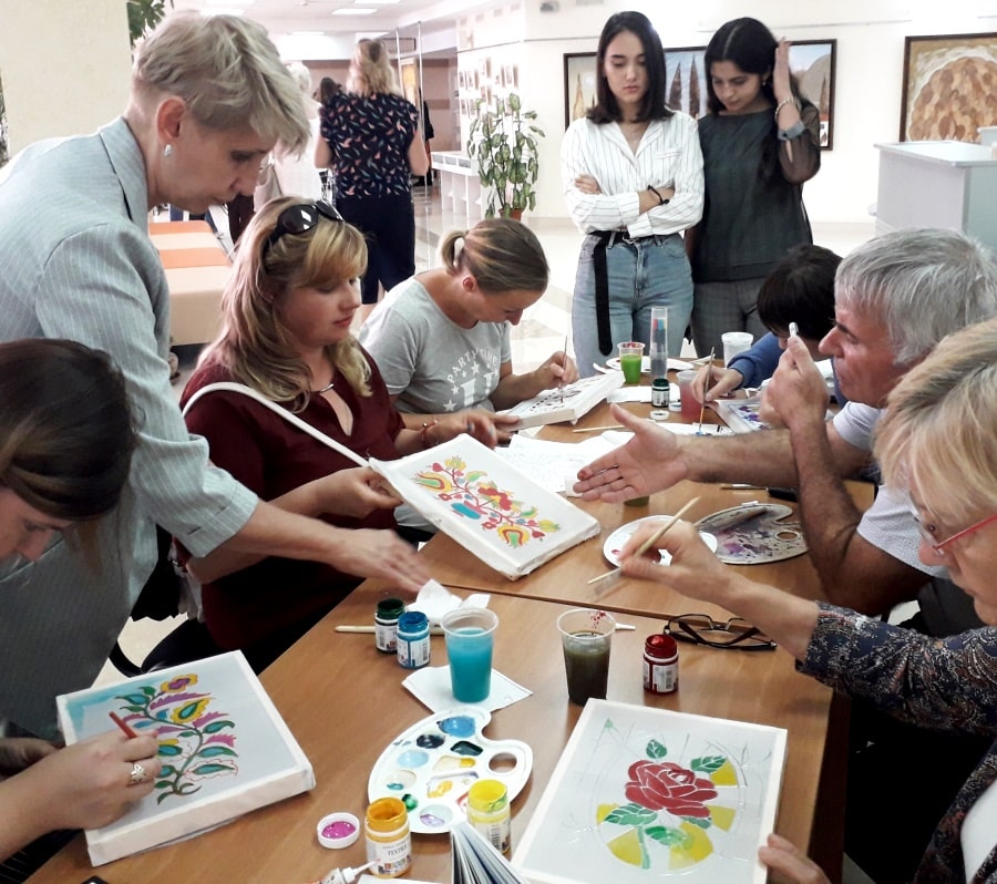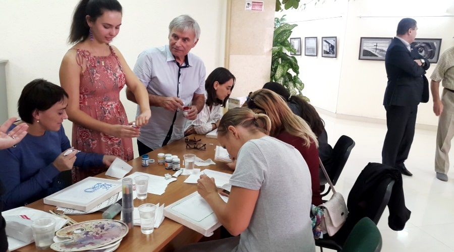 Вовлечь в действие создания орнамента нашей библиотеке помогли волонтеры – студенты кафедры изобразительного искусства Крымского инженерно-педагогического университета под руководством заслуженного художника Крыма, преподавателя Ирфана Нафиева. Молодые, талантливые студенты организовали для гостей мероприятия мастер-класс в технике «холодный» батик.