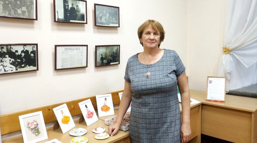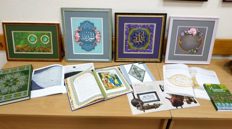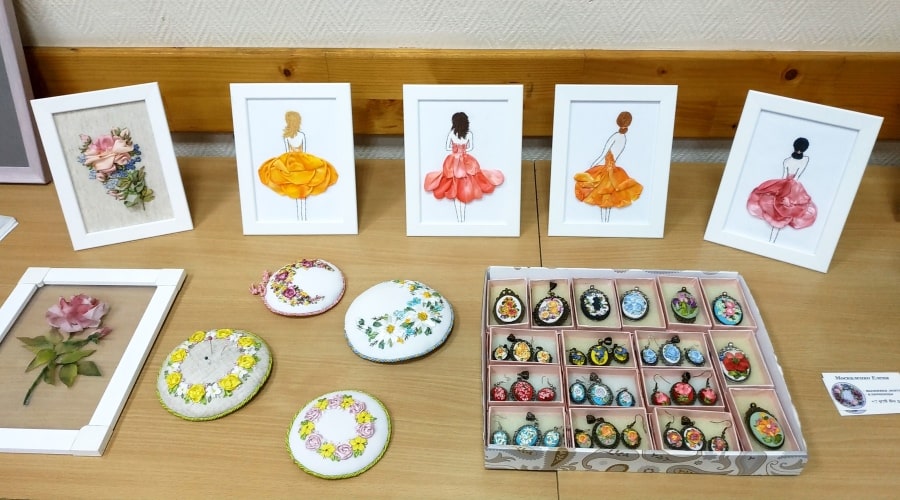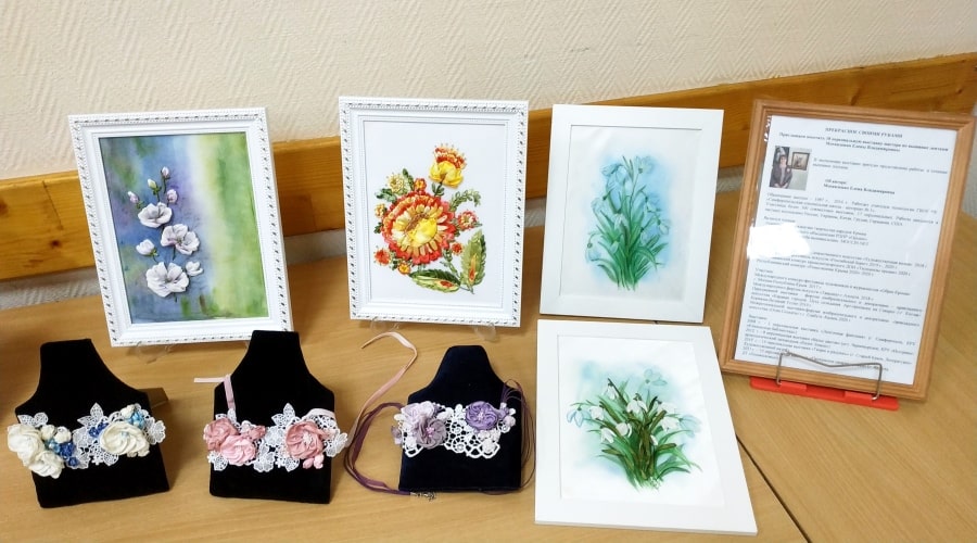 В экспозиции вниманию читателей были представлены работы в технике вышивки лентами: картины в мусульманской и флористической тематике, различные женские украшения и др.