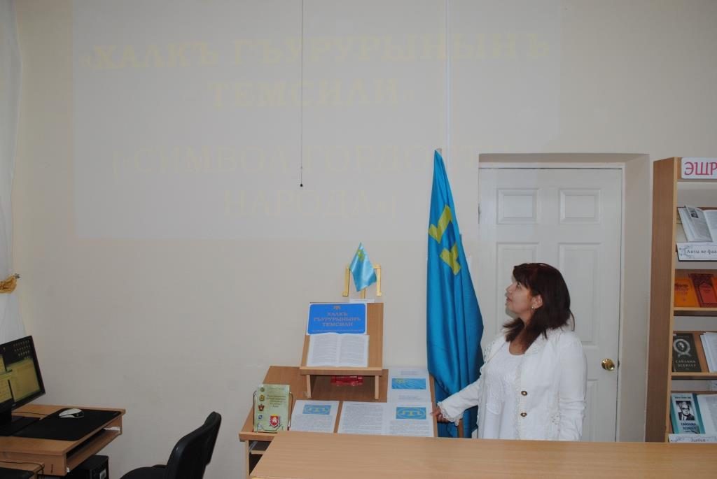 Файдаланыджыларгъа хызмет косьтерюв болюгининъ мудири Нурие Халилова тедбирни «Миллий байракъ – къырымтатар халкъынынъ гъурурыдыр!» сёзлеринен башлады. О, къырымтатар байрагъы – бу, сол кошесинде сары тамгъа олгъан мавы тюстеки басма парчасы экенини бильдирди. Байракънынъ мавы тюсю ачыкъ кок, теразе шеклиндеки сары тамгъа исе адалет темсилидир.