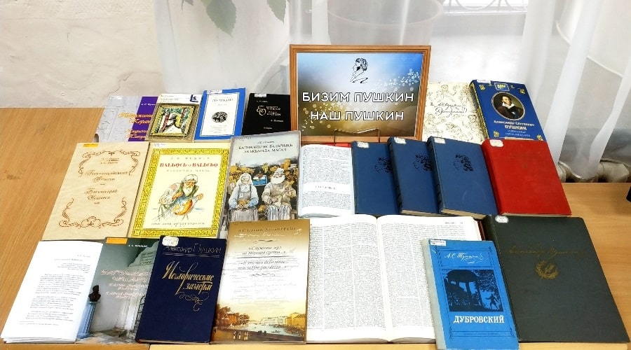 В рамках мероприятия в читальном зале библиотеки была организована книжная выставка «Бизим Пушкин» («Наш Пушкин») с материалами о жизни поэта, его произведениями на разных языках.