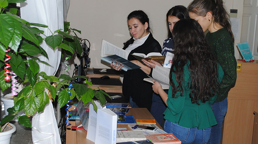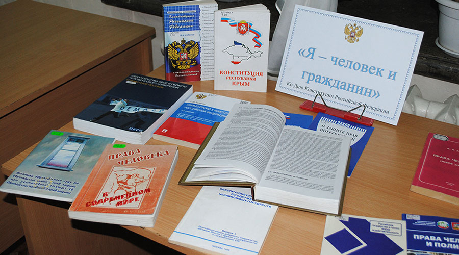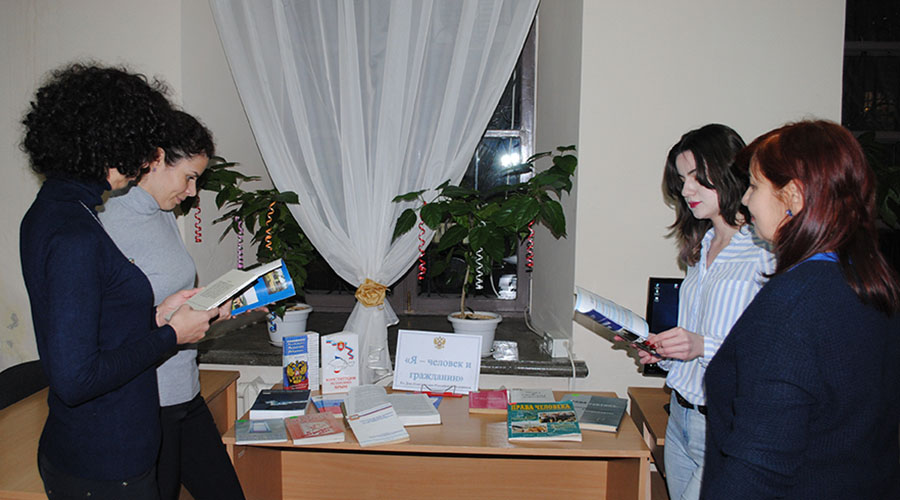 и организована тематическая выставка, на которой представлены «Международные акты о правах человека», сборники документов, сборники международных договоров, учебники по правам человека.