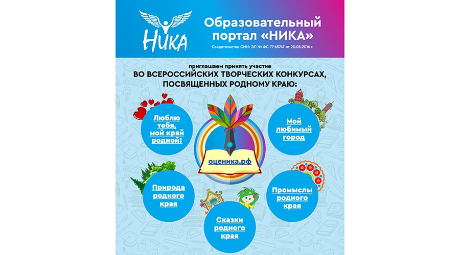Образовательный портал «НИКА», являющийся всероссийским сетевым СМИ (свидетельство Роскомнадзора РФ ЭЛ № ФС 77-65747 от 20.05.2016 г.), приглашает участникам погрузиться в изучение культуры родного края, проявить активный интерес к народным промыслам региона и принять участие во всероссийских творческих конкурсах о родном крае: