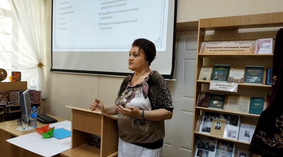 Методист высшей категории Гульнара Шосаидова презентовала социокультурный проект «Стажировочная площадка АРТ-МАСТЕРСКАЯ». Директор Медиацентра им. И. Гаспринского, кандидат педагогических наук Сайде Усманова представила вниманию библиотекарей издательскую продукцию медиацентра.