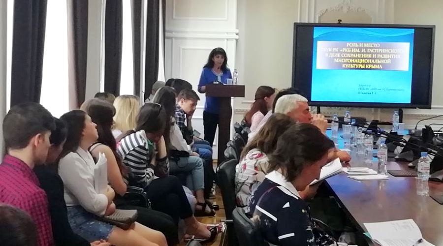 Директор библиотеки Гульнара Ягьяева на пленарном заседании выступила с докладом “Роль и место ГБУК РК «РКБ им И. Гаспринского» в деле сохранения и развития многонациональной культуры Крыма”