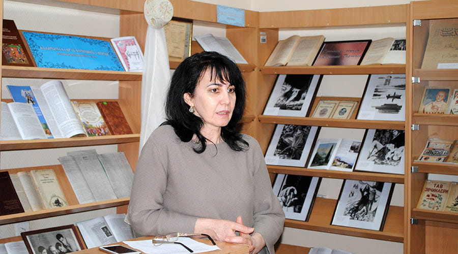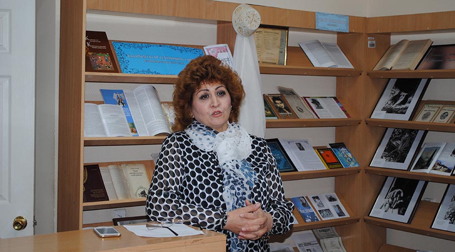 Заведующая отделом редких книг, рукописных материалов и книжных памятников Медине Алимова представила гостям библиотеки презентацию «Максим Горький в переводах на крымскотатарский язык».