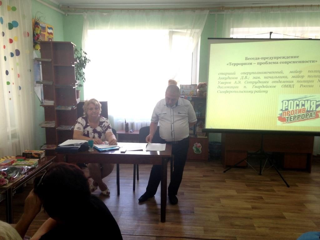 В районном семинаре принял участие старший оперуполномоченный отделения полиции №1 дислокации пгт. Гвардейское ОМВД России по Симферопольскому району майор полиции Анкудинов Д.В. Для библиотекарей района была проведена беседа-предупреждение «Терроризм – проблема современности».