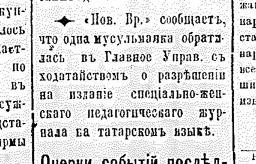 Разные вести : [«Новое время» сообщает, что одна мусульманка обратилась в Главное управление с ходатайством о разрешении на издание специального женского педагогического журнала на татарском языке]. – Текст : непосредственный // Переводчик. – 1887. – 31 дек. (№ 40). – С. 2.