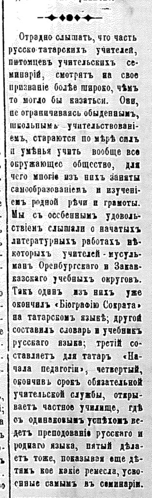 [О русско-татарских учителях питомцах учительских семинарий, которые кроме основной работы занимающихся литературной работой, другие обучают различным ремёслам] // Переводчик. – 1889. – 10 дек. (№ 43). – С. 89.