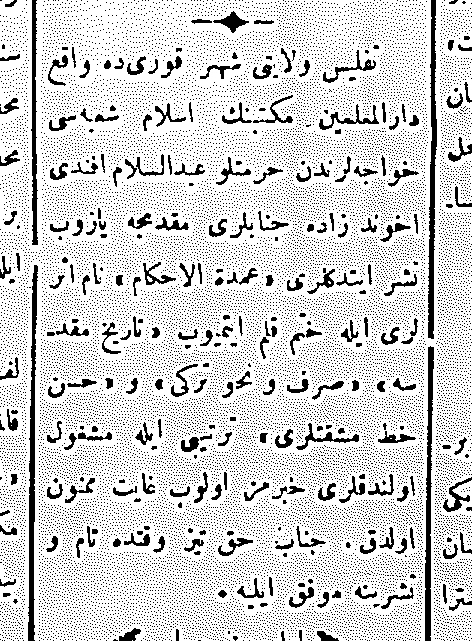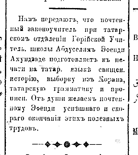 [Тифлис виляети Гори шеэринде дар-уль муаллимин мектебининъ ислям шубеси оджаларындан Абдусселям эфенди Ахунд-заде «Умдет-уль ахкям», «Тарих-и мукъаддиме», «Сарф ве нахв тюркий», «Хюсню хат (мишкъатлары)» тертибы иле мешгъуль олдугъы]. – Текст : непосредственный // Терджиман. – 1889. – Янв. 31 (№ 4). – С. 2.