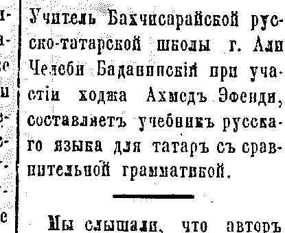 [Учитель Бахчисарайской русско-татарской школы г. Али Челеби Боданинский при участии ходжа Ахмед Эфенди, составляет учебник русского языка для татар с сравнительной грамматикой]. – Текст : непосредственный // Переводчик. – 1889. – 30 дек. (№ 46). – С. 97.
