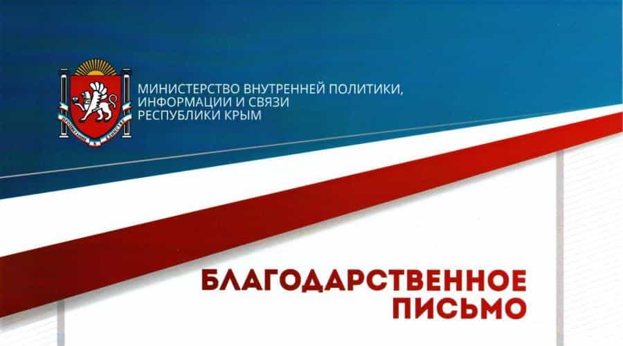 Министерство внутренней политики, информации и связи Республики Крым выражает признательность за социальную солидарность и поддержку при организации деловой программы в рамках проведения совместного с Правительством Санкт- Петербурга второго книжного фестиваля в Крыму «Книжные аллеи» (г. Ялта, с 5 июня по 5 июля 2018 года).